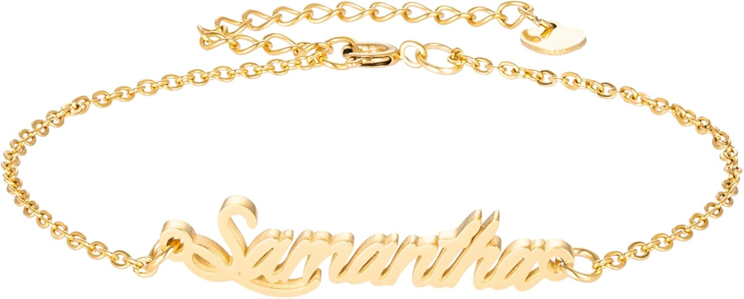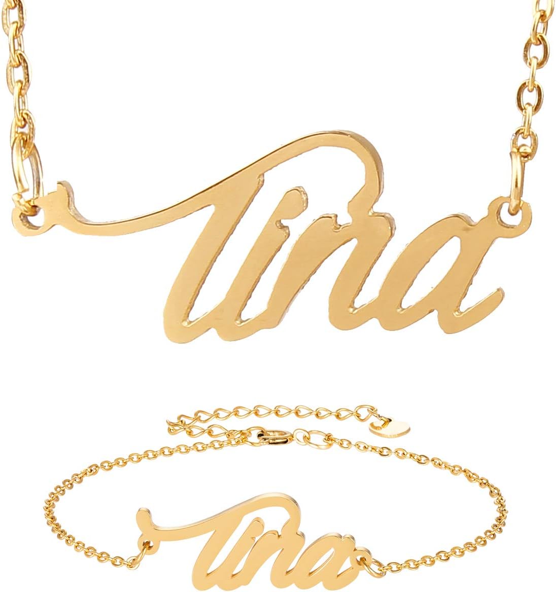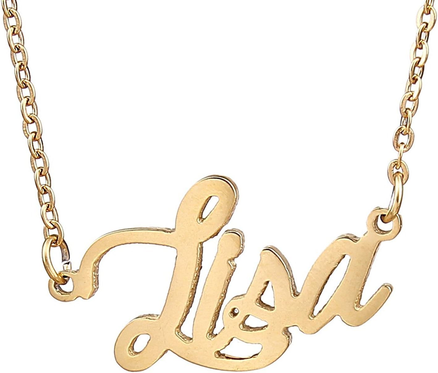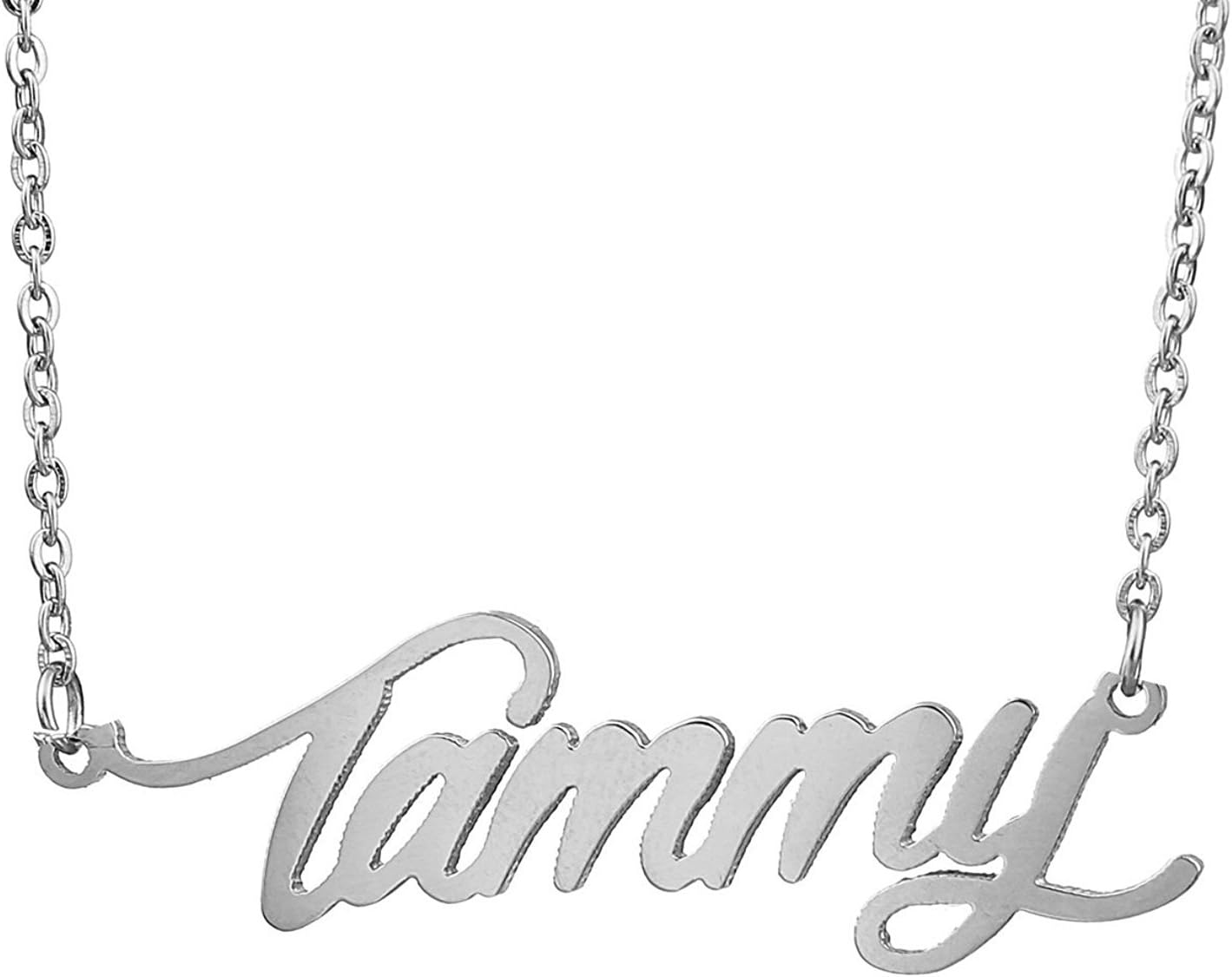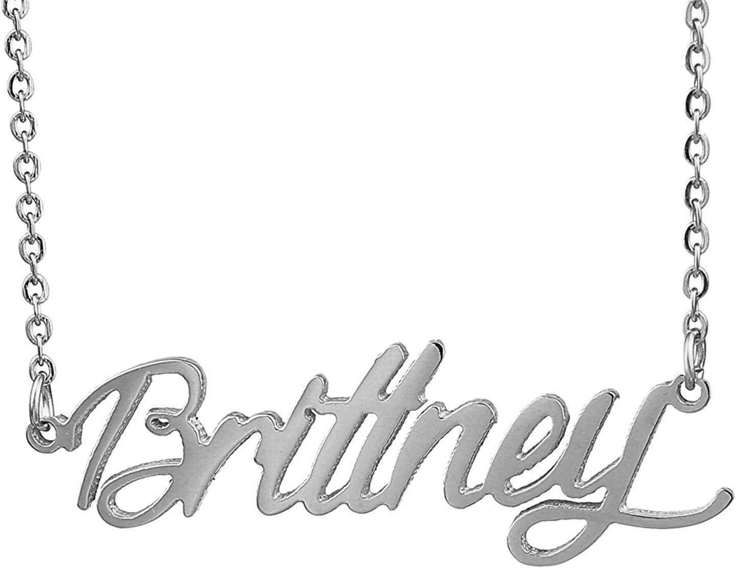 Specific Name Word in Golden Silver Color, Danity and Lightweight. Great gifts for best friends, mom, sister, grandaughter, cousin, wife, girlfriends. Product Details: Material: Stainless Steel, 18k Gold Plated. Chain length: 16" + 2" extension chain. Weight: 5-10 grams. Made in China.