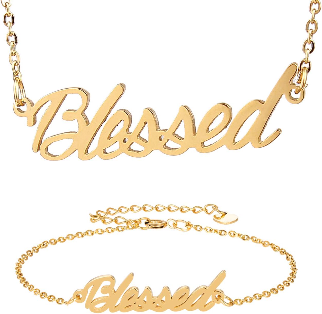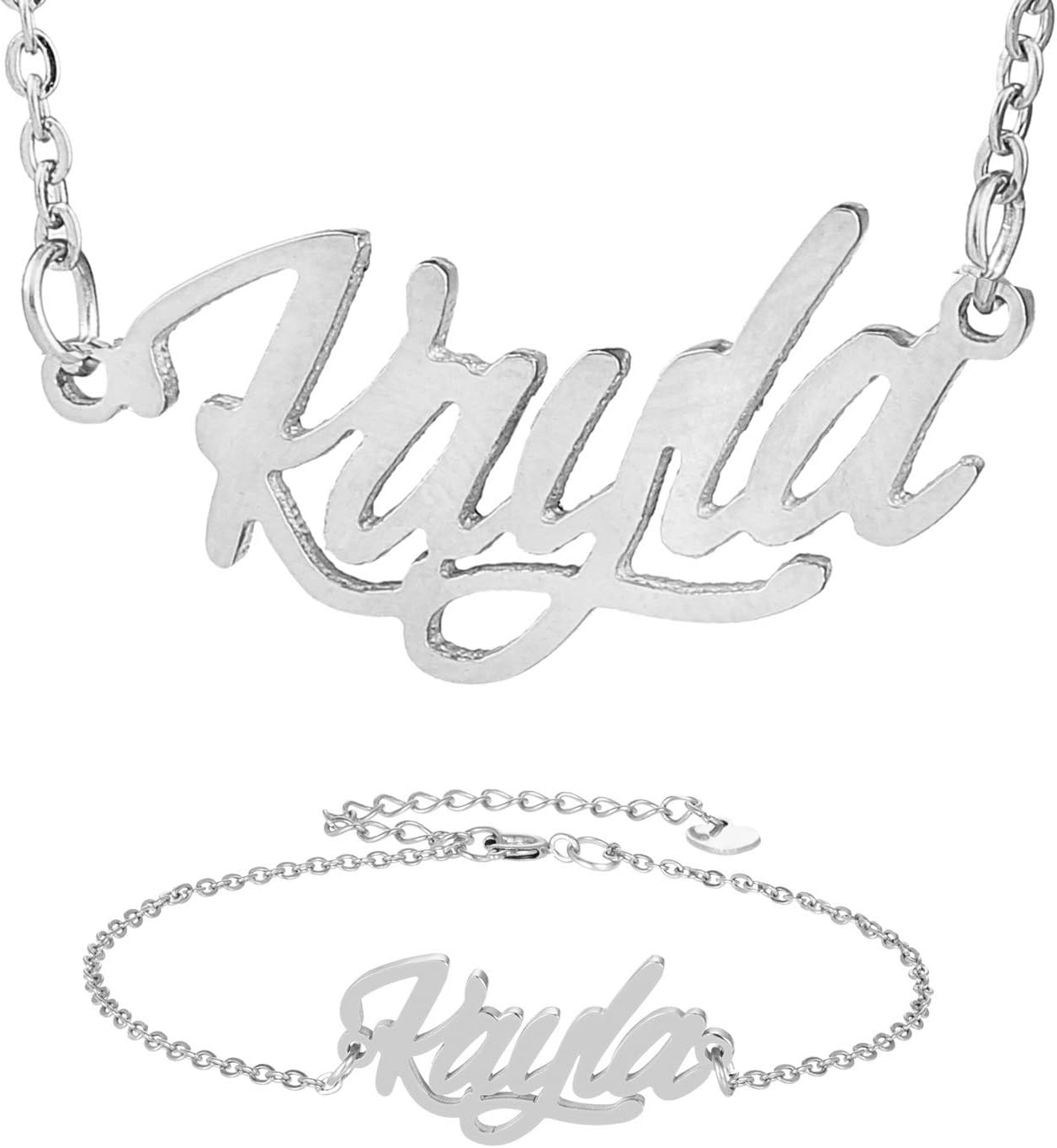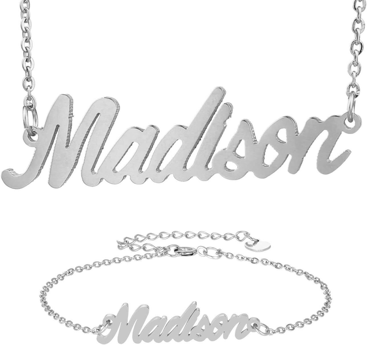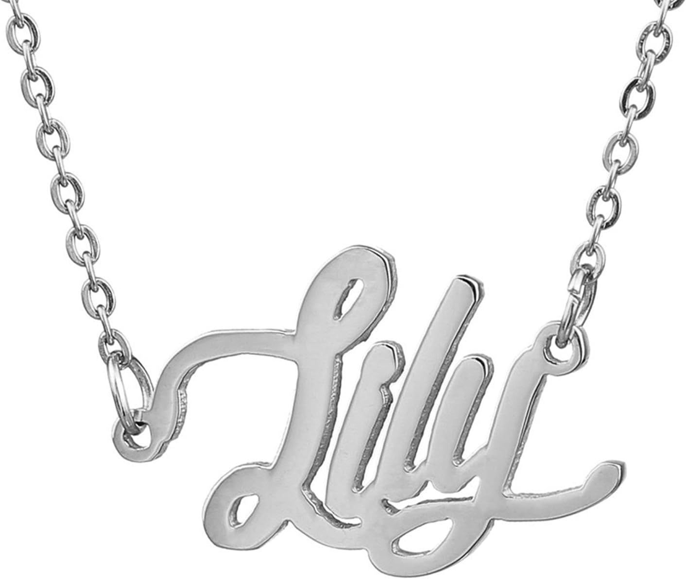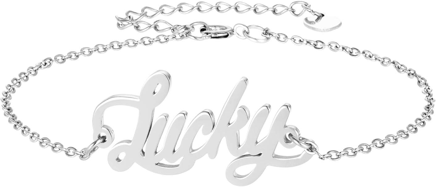 Specific Name Word in Golden Silver Color, Danity and Lightweight. Great gifts for best friends, mom, sister, grandaughter, cousin, wife, girlfriends. Product Details: Material: Stainless Steel, 18k Gold Plated. Chain length: 16" + 2" extension chain. Weight: 5-10 grams. Made in China.