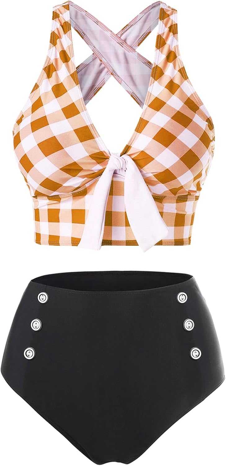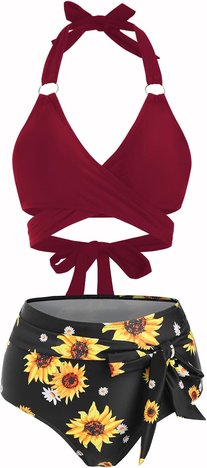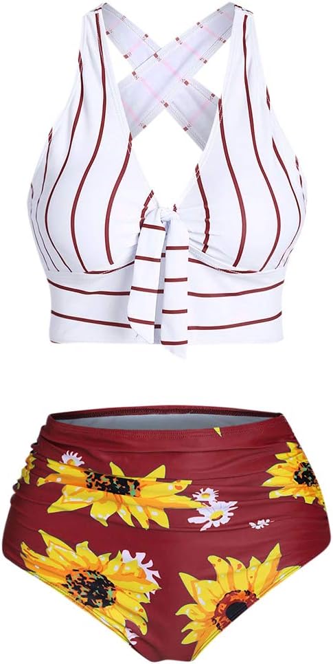 This summer-ready two-piece bikini set combines vibrant sunflower and striped prints with stylish knot ring details, a flattering high-waist fit, and a comfortable padded halter top for a confident and fashionable beach look